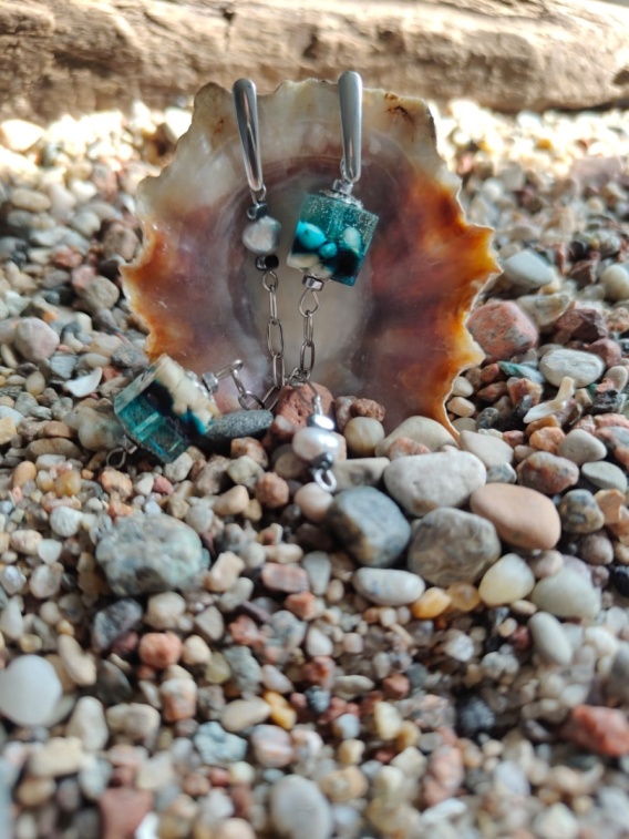 Te wyjątkowe kolczyki w kształcie kwadratu (10 mm) zostały ręcznie wykonane z żywicy epoksydowej, w której zatopiono prawdziwe skarby znalezione nad morzem — drobne kamyczki, piasek i fragmenty muszelek 🪸💧 Każdy egzemplarz jest niepowtarzalny, niczym ślad fal na brzegu Bałtyku.