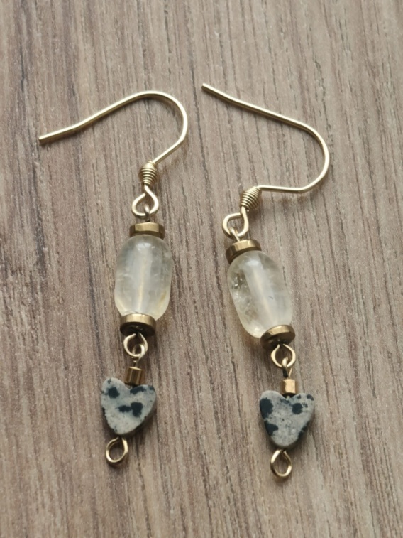 Te eleganckie kolczyki łączą w sobie naturalne piękno kamieni szlachetnych — cytrynu i jaspisu dalmatyńskiego. Ich całkowita długość to ok. 3,5 cm + bigle, które wykonane są ze stali chirurgicznej w kolorze złota, co nadaje kolczykom elegancki i trwały charakter 💛