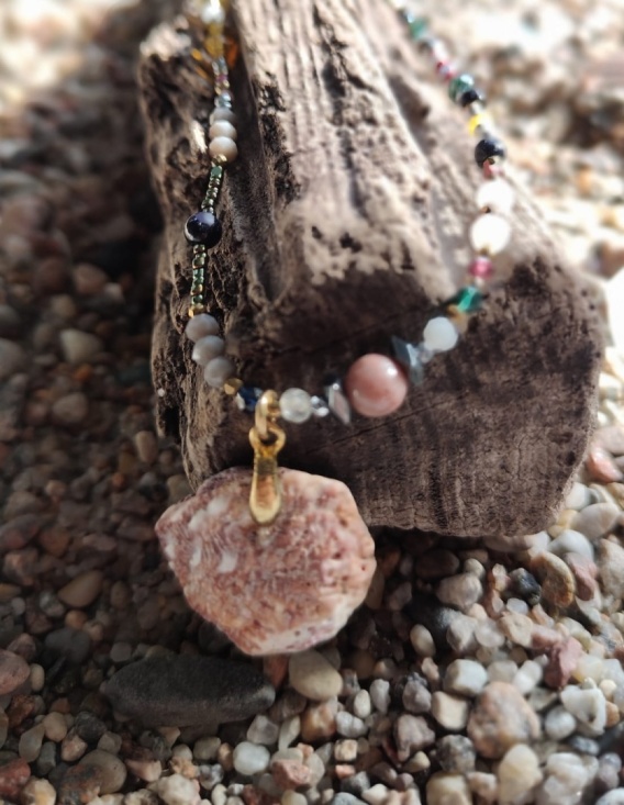 Naszyjnik łączy naturalne piękno muszli z kamieniami półszlachetnymi takimi jak turmaliny, hematyt, rodonit, jadeit, białą perłą i kamieniem księżycowym – każdy kamień ma swoje unikalne właściwości, tworząc harmonijną całość, która symbolizuje spokój i harmonię.