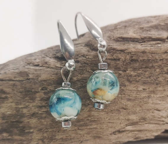Te delikatne kolczyki handmade powstały z miłości do morza i natury. Ich sercem są kulki z żywicy epoksydowej (średnica 8 mm), w których zatopiono prawdziwe kamyczki zebrane na brzegu Bałtyku oraz hematyt 🐚💎✨ Każda para jest niepowtarzalna, jak wspomnienie spaceru po plaży o zachodzie słońca.