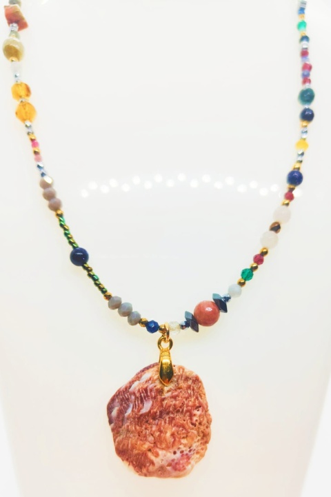 Naszyjnik łączy naturalne piękno muszli z kamieniami półszlachetnymi takimi jak turmaliny, hematyt, rodonit, jadeit, białą perłą i kamieniem księżycowym – każdy kamień ma swoje unikalne właściwości, tworząc harmonijną całość, która symbolizuje spokój i harmonię.